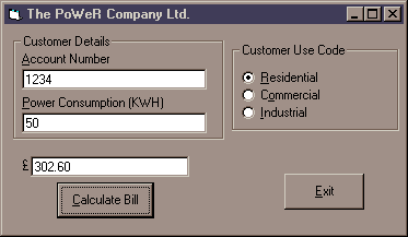 You will find the Val function useful for converting the text strings contained in the Account Number and Power Consumption text boxes into numbers, prior to calculating the bill.