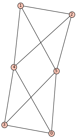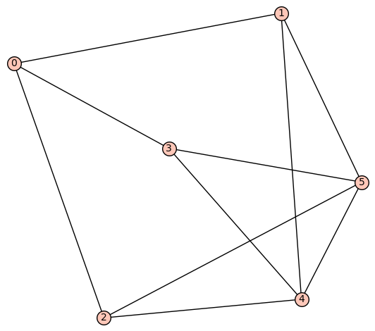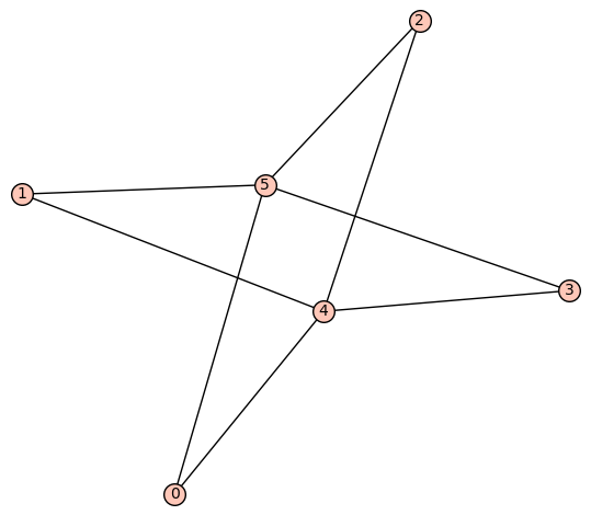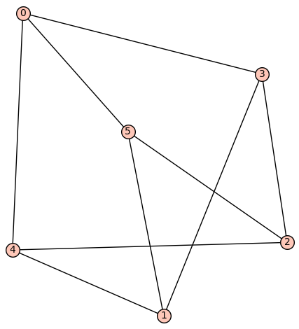 | 9 edges: | [[0, 3], [0, 4], [0, 5], [1, 2], [1, 4], [1, 5], [2, 3], [2, 5], [3, 4]] |