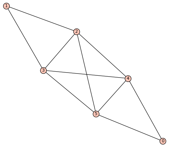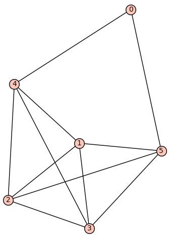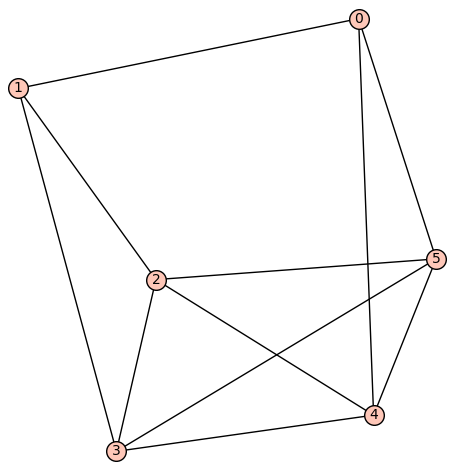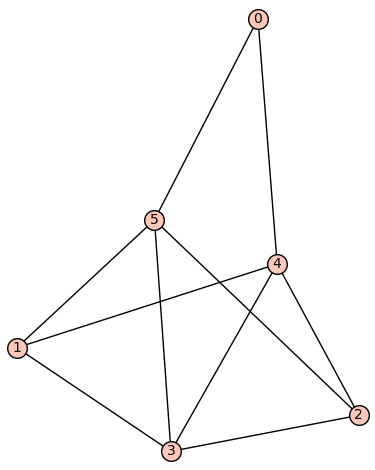 | 11 edges: | [[0, 1], [0, 4], [0, 5], [1, 2], [1, 3], [2, 3], [2, 4], [2, 5], [3, 4], [3, 5], [4, 5]] |