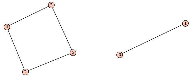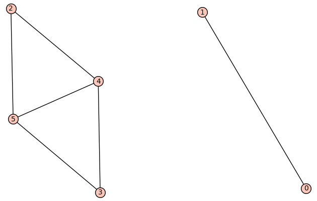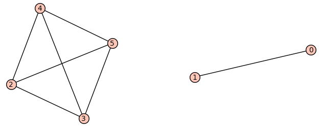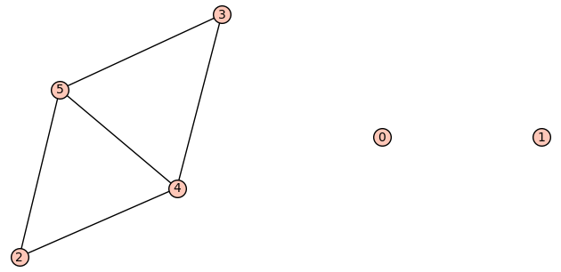 | 7 edges: | [[0, 1], [2, 3], [2, 4], [2, 5], [3, 4], [3, 5], [4, 5]] |