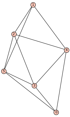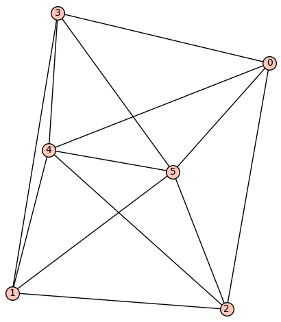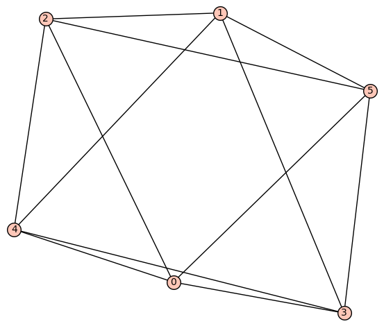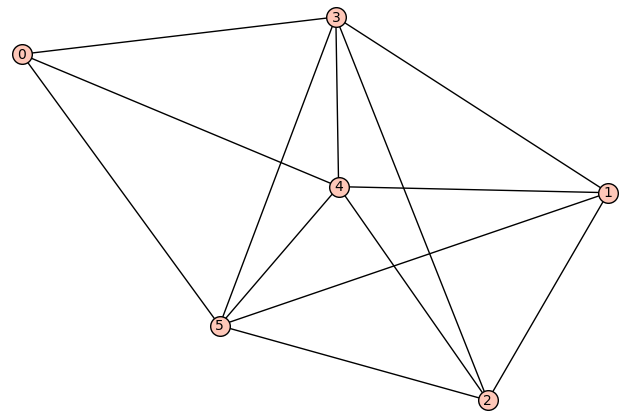 | 13 edges: | [[0, 3], [0, 4], [0, 5], [1, 2], [1, 3], [1, 4], [1, 5], [2, 3], [2, 4], [2, 5], [3, 4], [3, 5], [4, 5]] |