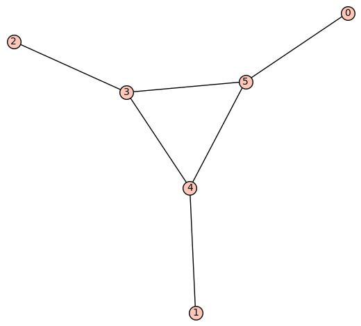 | 7 edges: | [[0, 2], [1, 4], [1, 5], [2, 3], [3, 4], [3, 5], [4, 5]] |