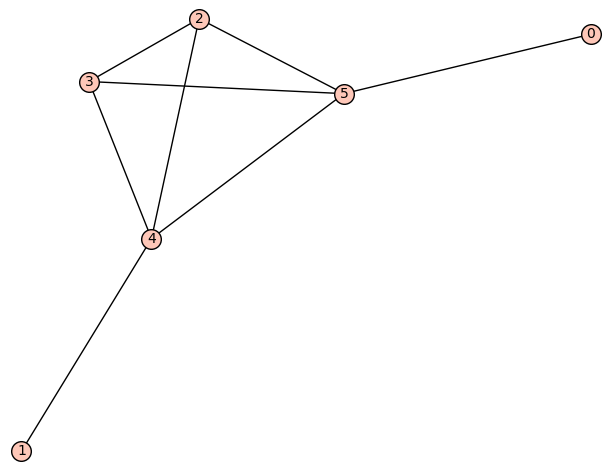 | 8 edges: | [[0, 1], [1, 5], [2, 3], [2, 4], [2, 5], [3, 4], [3, 5], [4, 5]] |