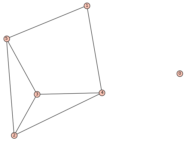 | 8 edges: | [[0, 1], [0, 5], [1, 4], [2, 3], [2, 4], [2, 5], [3, 4], [3, 5]] |
